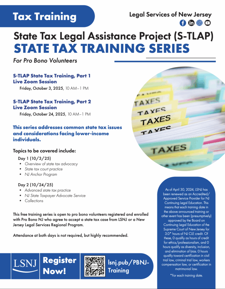 State Tax Law Training for Pro Bono Volunteers, Training Series Day 2, Legal Services of New Jersey (LSNJ) (Virtual)